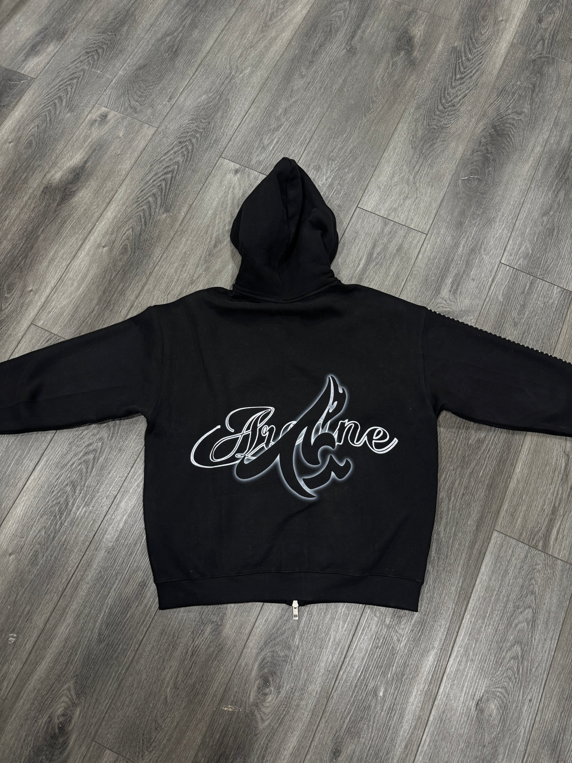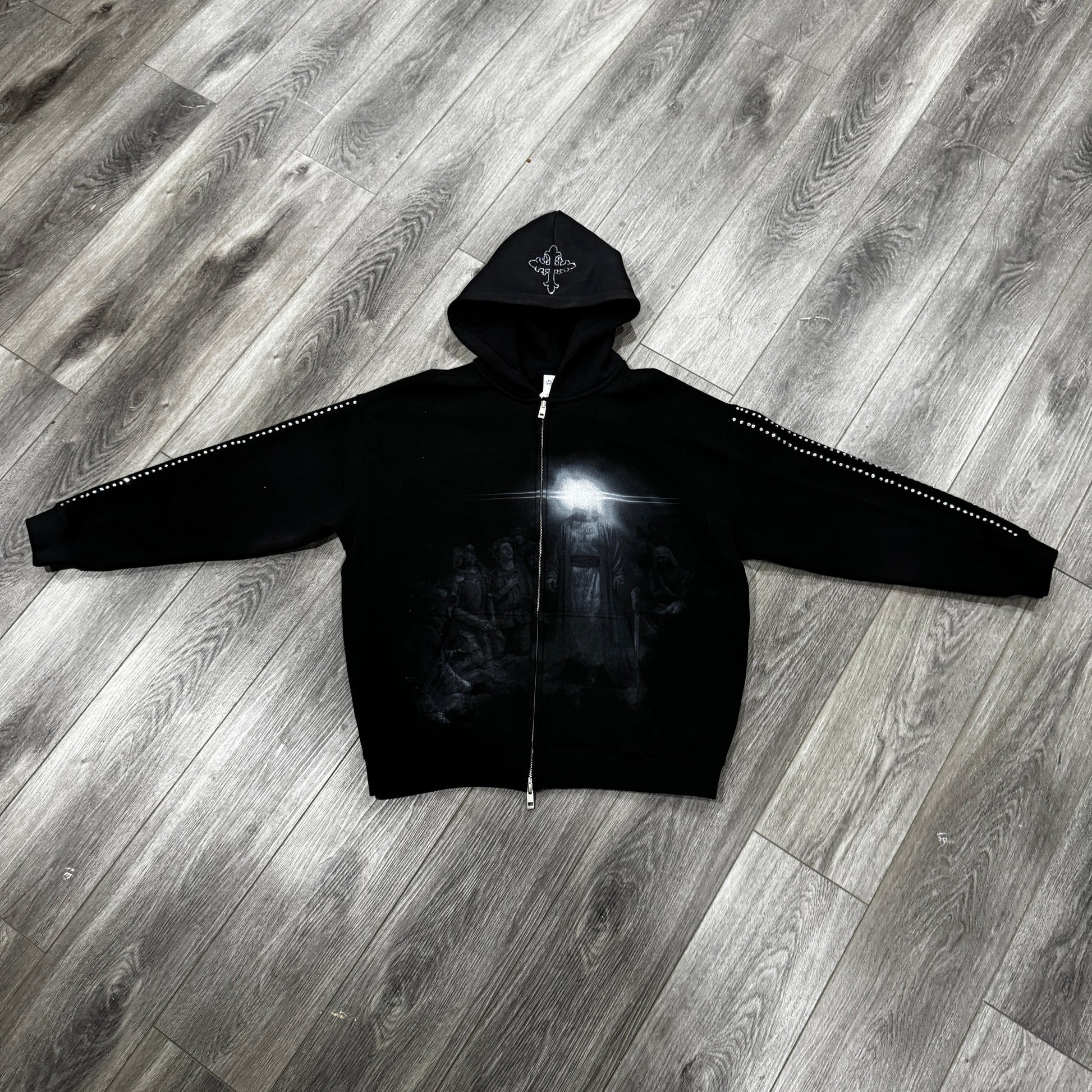 Premium black zip-up hoodie featuring a shining light scene graphic on the front and a cross embroidery on the back. This limited release hoodie is available for pre-order with extremely low stock.